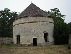 Der runde Turm aus Bruchsteinmauerwerk mit Kegeldach soll der größte Taubenturm in Frankreich sein, mit ursprünglich circa 8000 Tauben.