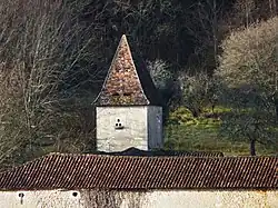 Der rechteckige Taubenturm aus Bruchsteinmauerwerk mit Eckquaderung aus Haustein steht am Rande des Manoir. Das Pyramidendach wird von flachen Ziegeln gedeckt.[1]