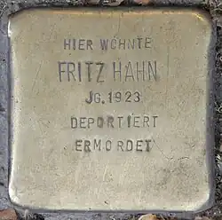Drei Stolpersteine erinnern an die Mitglieder einer Familie Hahn in der Hausnummer 13a, die als Juden ab 1941 deportiert und ermordet wurden. Vier weitere Stolpersteine liegen in der Tauentzienstraße 7 für Familie Hirsch.