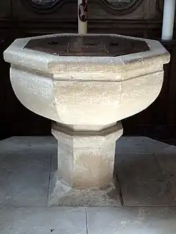 Das einen Meter hohe und 94 cm breite Taufbecken aus Kalkstein steht auf einem achteckigen Sockel. Das achteckige Becken ist godroniert und am oberen Rand mit einem Wulst versehen.