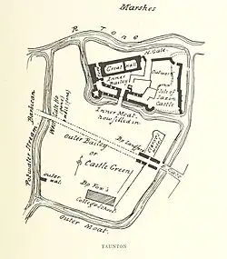 Taunton Castle war ein typischer normannischer Donjon aus der ersten Hälfte des 12. Jahrhunderts, 15 Meter lang und 12 Meter breit,[2] mit drei Stockwerken und etwa 4 Meter dicken Wänden. Er war an die steinernen Mauern einer Kernburg eingebaut und es gab eine Vorburg, die heute als Castle Green sichtbar ist. Bis zum Ende des 17. Jahrhunderts diente die Burg noch als Gefängnis.[10]