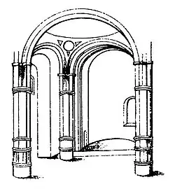 Der Tambour war innen kreisrund und außen sechzehneckig. Die Wandfelder waren durch flache Halbsäulen und Blendbögen abgegrenzt, jedes zweite Wandfeld durchbrach ein langer schmaler Fensterschlitz. Den äußeren Abschluss über der Kuppel bildete ein steinplattengedecktes Pyramidendach. Innen erfolgte der Übergang aus dem Bogenquadrat in die Kreisform des Tambours durch Pendentifs. Das Dach des Kirchenschiffs ist nur noch teilweise über dem Obergeschoss des Nordarms erhalten. Hier ist zu sehen, dass die Dachkonstruktion aus Baumästen bestand, die mit Mörtel überdeckt und darin eingebettet wurden. Darüber verlegte man Tondachplatten.