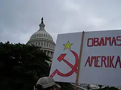 Aus der Tea-Party-Bewegung und ihrer Anhängerschaft heraus wurde Obama häufig rassistisch konnotiert angegriffen. So wurde er auf einem Parteikonvent im März 2011 von der Radiomoderatorin und Aktivistin Laurie Roth als ein heimlicher Muslim und Kommunist bezeichnet, der sich nur als Amerikaner ausgebe. Die Verschwörungstheorie, Obama sei kein Natural born citizen, wurde auf diesem Parteitag ausführlich thematisiert und zu persönlichen Attacken auf den Präsidenten genutzt.[35] Eine Stichprobenuntersuchung von Christopher S. Parker und Matt A. Barreto unter Anhängern der Tea-Party-Bewegung ergab, dass viele von ihnen Obama für einen Sozialisten halten und über 90 % ihn negativ beurteilen.[36]
