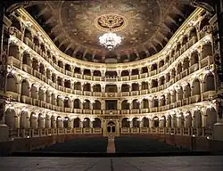 Der hufeisenförmige Saal bietet Platz für 1084 Zuschauer. Eine Besonderheit dieses Hauses ist ein hölzerner Mechanismus, der 1820 eingebaut wurde und mit dem der Saalboden auf Höhe der Bühne angehoben werden kann. Der Mechanismus wurde für Feiern und ähnliche Veranstaltungen genutzt und ist derzeit außer Betrieb, aber noch vollständig erhalten und kann bei Führungen besichtigt werden.[1]