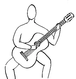 Nicht zuletzt ist es hilfreich, auch die Decke der Gitarre nicht gänzlich frontal auszurichten, also im rechten Winkel auf den Oberschenkeln, sondern in einem leichten Winkel (ca. 10 Grad) nach oben zu kippen. Diese leichte Schrägstellung der Gitarre ermöglicht dem Spieler eine bessere Augenkontrolle des Spiels ist aber auch motorisch sinnvoll, da durch diese Haltung das Gewicht der Greifhand zur Verstärkung des Greifdrucks eingesetzt werden kann (was insbesondere bei Barré-Griffen hilfreich ist).