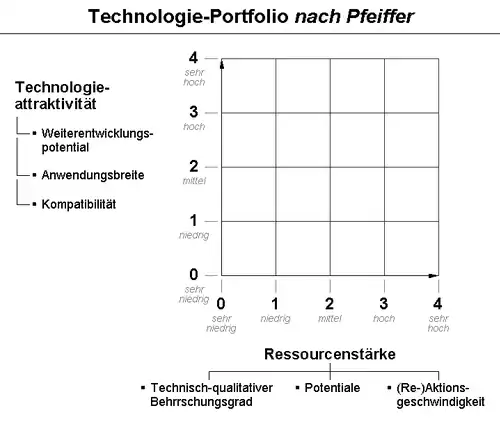 - ↑ Metze (2008), S. 325 nennt als Entwicklungszeitraum „Ende der 1970er Jahre“. Die erste umfassende Darstellung der Technologie-Portfolio-Analyse als Planungsinstrument ist Pfeiffer u. a. (1982). Zusammenfassende Darstellungen des Technologie-Portfolio-Konzepts von Pfeiffer als etabliertem Planungsinstrument des strategischen Managements geben unter anderem Voigt (2008), S. 162 ff., Vahs/Burmester (2005), S. 125 ff. und Gerpott (2005), S. 154 ff.