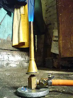 Der Teclubrenner (benannt nach seinem Erfinder Nicolae Teclu) ist ein kleiner Gasbrenner, welcher zum Erhitzen im chemischen Labor eingesetzt wird. Er saugt wie der verwandte Bunsenbrenner nach dem Prinzip der Strahlpumpe die Verbrennungsluft an, unterscheidet sich aber durch die Art der Luftzuführung und durch die Form des Brennerrohrs (Kamin): Beim Teclubrenner wird die Luft von unten in den Kamin eingeführt. Das Rohr ist nach unten konisch erweitert und hat einen größeren Durchmesser. Auf diese Art wird eine intensivere Durchmischung der Gase und damit eine höhere Flammentemperatur erreicht.[1] Der Spalt zur Luftzuführung kann durch ein horizontales Drehrad unter der konischen Erweiterung des Kamins vergrößert oder verkleinert werden (bis zum totalen Verschluss, wenn das Drehrad den Konus ganz verschließt).