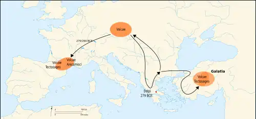 279/278 v. Chr. zog ein Teil der Tektosagen im Zuge der Keltischen Südwanderung zusammen mit Tolistobogiern und Trokmern durch Thrakien. Ihr Ziel war die Region um Byzantion (Byzanz, Konstantinopel), wo sich die Kelten vorerst niederließen. 275 v. Chr. wurden sie von Nikomedes I. als Söldner nach Bithynien geholt, um ihm dort im Kampf gegen seinen Bruder zu unterstützen und ihm den Thron zu sichern. Bald machten sie sich selbständig und zogen plündernd durch das westliche Kleinasien. In der sogenannten „Elefantenschlacht“ 275, 268 oder 267 v. Chr. wurden die Galater von Antiochos I. geschlagen und erhielten Wohngebiete beiderseits des Halys zugewiesen. Die Tektosagen besiedelten das Gebiet um Ankyra (Ankara).[4][5]