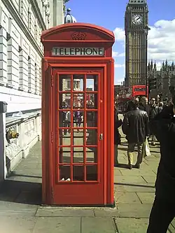 Die klassischen roten Telefonzellen, englisch telephone booth, telephone box oder red telephone box der Postbehörde des Vereinigten Königreichs aus dem Jahr 1924 sind wegen ihres markanten Designs weithin bekannt. Ihr Vorgänger mit der Bezeichnung K1 war noch aus Beton gefertigt und mit einer Holztür versehen.