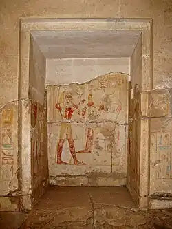 An der Rückseite der zweiten Pfeilerhalle, der Südwestseite, führen drei Türöffnungen zu den Kapellen der drei Hauptgötter des Tempels. Das mittlere Heiligtum galt der Verehrung des Osiris, links daneben befand sich der Raum, der Horus geweiht war, rechtsseitig die Kapelle der Isis.[10] Vor dem Eingang des Osirissanktuars wurde nachträglich eine Alabasterstele errichtet, die ursprünglich nicht in diesen Tempelteil gehörte. Von der ehemaligen Alabasterauskleidung des Heiligtums ist kaum noch etwas vorhanden. Das Steindach fehlt ebenso und wurde durch ein Holzbalkendach zum Schutz vor Witterungseinflüssen ersetzt.