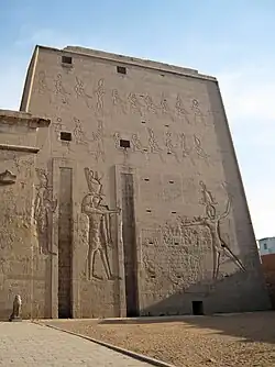 Beidseitig des Portals sind jeweils zwei senkrechte Aussparungen in der Fassade erkennbar, die der Aufnahme von Fahnenmasten mit farbigen Fahnen dienten. Zwischen ihnen befinden sich auf beiden Seiten je ein Relief des Hauptgottes des Tempels Hor-Behdeti („Horus von Edfu“) und seitlich zum Portal ein kleineres Relief der Göttin Hut-Hor-Iunet („Hathor von Dendara“), einer lokalen Form der Göttin Hathor des Ortes Dendara 130 Kilometer nördlich von Edfu. Die Götter blicken nach außen auf zwei Großreliefs an jeder Fassadenseite, wo ihnen der Pharao Ptolemaios XII. (Neos Dionysos) Gefangene als Opfer darbringt.[10] Vor dem Pylon stehen rechts und links des Tempeleingangs zwei Falkenstatuen aus schwarzem Granit. Diesen Horusdarstellungen fehlen heute ihre Kronen, die eine ähnliche Statue im Innenhof des Tempels noch trägt.
