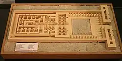 - 2) zum anderen in einen Arbeitsraum oder Labor, in dem die Opfergaben für die Zeremonien vorbereitet wurden. An den Wänden dieses Raumes sind die Zutaten verzeichnet, die für den Ritus verwendet wurden. Nach den Vorbereitungshandlungen brachte man die zu opfernden Gegenstände in den „Raum der Opfergaben“ hinter der zweiten Säulenhalle in Richtung Heiligtum. Von ihm gehen zwei Treppen auf die darüber gelegene Terrasse ab.[15]