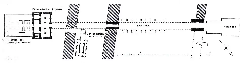Vom ptolemäischen Tempeleingang des Hypostyls bis zur ehemaligen Kaianlage sind es etwa 130 Meter. Ein gepflasterter Weg verband den Tempel mit dem Nilufer. An ihm waren unter Ptolemaios IV. Philopator (I.) seitlich auf eine Länge von 30 Metern Sphingen aufgestellt, die heute gänzlich fehlen. Etwa 25 Meter nördlich des ptolemäischen Hypostyls, rechtsseitig des Weges zur Kaianlage, befand sich die Barkenstation des Thutmosis III. aus der Zeit des Neuen Reiches, der 18. Dynastie. Von ihr sind einige Mauer- und Pfeilerreste erhalten, die restauriert und wieder aufgestellt wurden. Die Barkenstation hat einen rechteckigen Grundriss mit 16 Außenpfeilern. Zum Hauptweg führt ein ebenfalls gepflasterter Weg.