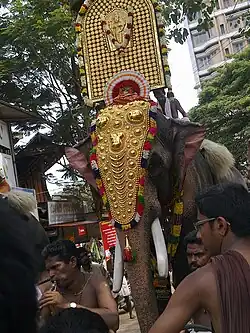 Darüber hinaus gibt es besondere religiöse Feste mit glamourösen Elefanten-Prozessionen und Paraden, die auch viele Touristen anziehen – besonders bekannt sind die Elefantenparaden in Kerala.[44] Bei den großen Tempelfesten werden zusätzlich Elefanten und deren Mahuts „angemietet“, was pro Elefant bis zu etwa 10.000 Dollar pro Festival kosten kann.[44] Der oben erwähnte Guruvayur-Tempel vermietet beispielsweise seine Elefanten und nahm um 2019 für einen „berühmten Elefanten“ („celebrity elephant“) 700.000 Rupien (= ca. 11.600 Dollar) pro Tag.[45]