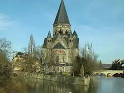 So kam ein Bauplatz im sogenannten „Jardin d’amour“ auf der kleinen Moselinsel ins Spiel. Diesen Bauplatz empfahl auch der renommierte Stadtplaner Josef Stübben, der mit den Plänen zur Metzer Stadterweiterung beauftragt worden war.[11] Gegen die Fällung der alten Bäume auf der Spitze der kleinen Moselinsel zugunsten des Kirchenneubaues organisierten sich etwa fünfhundert Bürger und richteten eine entsprechende Petition an Kaiser Wilhelm II. Die Landesregierung des Reichslandes Elsaß-Lothringen leitete die eingereichte Petition erst gar nicht weiter und sandte sie direkt wieder nach Metz zurück.[12] Nachdem auch Kaiser Wilhelm II. den Bauplatz als geeignet erachtet hatte, stimmte der Gemeinderat der Stadt Metz am 10. Februar 1899 schließlich dem Neubau der Kirche an der Süd-West-Spitze der kleinen Moselinsel zu.[13]
