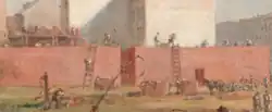 „Wir können nebeneinander fast alle Stufen des Bauprozesses beobachten, angefangen bei den Ausschachtungsarbeiten, über die Fundierung, die Aufmauerung der Außenwände, die Anlieferung der Holzbalken für die Decken bis hin zum fertigen, frisch verputzten Vorderhaus, an dessen Rückseite noch das Putzergerüst steht.“[10]
