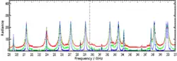 Die Grafik rechts zeigt ein THz-Emissionsspektrum der höheren Erdatmosphäre. Mit Abnahme der Höhe und des Drucks sinkt die Wechselwirkung zwischen den Molekülen. Die Eigenfrequenzen werden schärfer, die Linienbreite nimmt ab. Die rote Linie entspricht einem Druck von 100 hPa, die grüne von 30 hPa und die blaue von 10 hPa. Die Emissionen aus unterschiedlichen Höhen überlagern sich. Dennoch gelingt eine Entfaltung der Linienbreiten und eine höhenabhängige Konzentrationsmessung der Gasanteile mit einem Fehler in der Größenordnung der Skalenhöhen (ca. 10 km).[2]