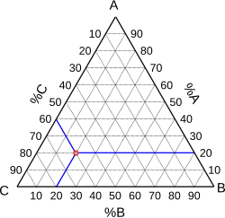 Um die Zusammensetzung eines solchen Gemisches graphisch darzustellen, verwendet man ein so genanntes Gibbssches Dreiecksdiagramm.[1] Die Verwendung des gleichseitigen Dreiecks zur Darstellung von Gemischen aus drei Stoffen erfolgte erstmals durch Josiah Willard Gibbs, der als Koordinaten die drei Höhen des Dreiecks benutzte.[2]