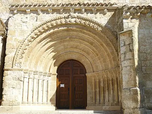 Die über eine halbrunde mehrstufige Treppe erreichbare und aus weitgehend exakt behauenen Steinen erbaute örtliche Pfarrkirche San Andrés Apóstol stammt aus dem späten 12. Jahrhundert; sie erhebt sich auf dem höchsten Punkt des Ortes. Das geringfügig aus der umgebenden Mauerflucht hervortretende Archivoltenportal ist sechsfach gegliedert, aber ansonsten schmucklos; es wird von einem größeren und einem kleineren Zackenband überfangen und bildet den architektonisch-dekorativen Höhepunkt der Kirche. Diese ist einschiffig und nahezu fensterlos; unmittelbar vor der halbrunden Apsis wurden zwei Seitenkapellen hinzugefügt, so dass das Ganze beinahe wie ein Querhaus wirkt. Der auf rechteckigem Grundriss erbaute Glockenturm (campanario) ist ein Werk des 18. Jahrhunderts.[7]