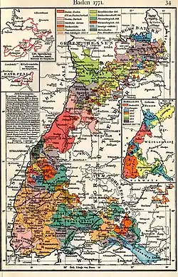 Da sich Württemberg und Bayern in ihrem Grenzvertrag auf eine einzige, durchgehende Grenzlinie verständigten und Badens Westgrenze weitgehend durch den Rhein bestimmt war, gab es an diesen Stellen keinerlei wechselseitige Gebietseinschlüsse. Baden und Württemberg regelten ihre Grenzangelegenheiten jedoch vornehmlich durch den Austausch einzelner Herrschaftsrechte, so in den Verträgen von 1808 und 1843/46.[8][9] Zu einer großen Lösung kam es nicht, solange die alten Länder Bestand hatten, so dass etliche territoriale Besonderheiten bestehen blieben; nach 1810 bestanden im Bereich der südwestdeutschen Staaten noch über 30 Exklaven und, als territoriale Kuriosität, Kondominate. Die meisten dieser Gebietseinheiten bestanden aus einzelnen Dörfern. 1850, als die hohenzollernschen Fürstentümer an Preußen übergingen, wurden diese als Ganzes zu einer preußischen Exklave.