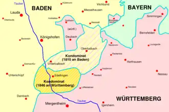 - Edelfingen (→Karte 7): In Edelfingen entwickelte sich eine Ganerbschaft, an der 1639 der Deutsche Orden 5/8, die Herren von Hatzfeld 2/8 und die von Adelsheim 1/8 besaßen. Der Hatzfelder Anteil fiel 1794 an das Hochstift Würzburg heim und ging nach einer kurzen hohenlohischen Phase (1803–1806) an Württemberg, das 1809 auch den Deutschordensanteil erhielt. Baden hingegen erhielt 1806 das Adelsheimer Achtel, so dass Edelfingen zu einem Kondominat zwischen Baden und Württemberg wurde.[26] Baden trat seinen Kondominatsanteil zusammen mit dem an Widdern 1846 an Württemberg ab.[9]