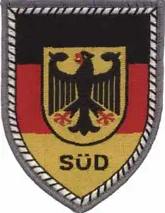 - „Von einer silbernen Kordel mit eingeflochtenem schwarzen Faden gefasst, geteilt zu Schwarz, Rot, Gold in goldenem Mittelschild ein einköpfiger schwarzer Adler, den Kopf nach rechts gewendet, die Flügel offen, aber mit geschlossenem Gefieder, Schnabel, Zunge und Fänge von roter Farbe (Bundesadler); der Mittelschild unten begleitet von Wort SÜD in schwarzen lateinischen Großbuchstaben.“