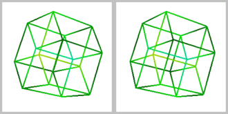 3D-Projektion eines 8-Zells, der eine einfache Rotation um eine Ebene ausführt, die die Figur von vorne links nach hinten rechts und von oben nach unten teilt