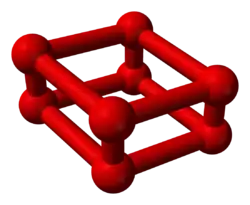 Gestützt auf infrarotspektroskopische Messungen wurde seit 1999 angenommen, dass es sich bei ε-Sauerstoff um Tetrasauerstoffmoleküle, also O4 handelt. Jedoch konnten neuere kristallographische Studien die Existenz von O8-Aggregaten im ε-Sauerstoff nachweisen. Die O8-Struktur unterscheidet sich aber von den kronenförmigen S8-Ringen des Schwefels und ähnelt einem etwas zusammengedrückten Würfel, bei dem jeweils zwei Sauerstoffatome an den vier verkürzten Kanten sitzen. Die Bindungen in den O2-Einheiten betragen 120 Pikometer (pm) und entsprechen damit der Bindungslänge von molekularem Sauerstoff unter Normalbedingungen (121 pm), während die Abstände in den O4-Ringen mit 219 pm deutlich kleiner als der Van-der-Waals-Abstand von 304 pm für Sauerstoff sind. Auch die kurzen Abstände von ca. 260 pm zwischen den O8-Quadern deuten auf bindende Wechselwirkungen hin.