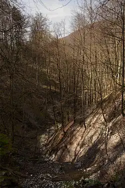 Unterhalb des Quelltisches schließt sich die eigentliche V-förmig eingetiefte Klinge in den Mergelsteinen der Impressamergel-Formation (ox1, früher Weißer Jura alpha) an. Die steil-schrägen Schutthänge der Klinge sind dicht mit Bäumen bewachsen. Deutlicher Säbelwuchs vieler Bäume indiziert, dass die Hänge in Bewegung sind.