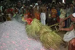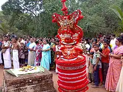 Die Aufführung dieses Teyyams beinhaltet beide Elemente des Todes. Der Darsteller ist auf seinem Oberkörper mit zwei gewundenen Schlangen bemalt und muss durch ein Feuer gehen.[27]