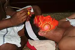 - Der Darsteller erhält das gesamte Kostüm und den Kopfputz (oliyuduppu). Im Besessenheitstanz verkörpert er die Gottheit (teyyam).