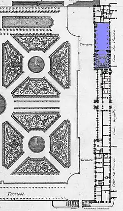Streng hierarchisch wurden die verschiedenen Elemente angeordnet, die doch ein zusammenhängendes Ganzes bildeten.[51] Direkt vor der Bühne gab es Platz für das Orchester und die Garde, dann im Parkett die abgegrenzte königliche „Loge“ (der Begriff stand damals eigentlich für jede Sitzgelegenheit).[52] Zu jener konnte Ludwig sich auch durch einen unter dem Boden verborgenen Gang zurückziehen, nachdem er auf der Bühne getanzt hatte.[53] Zum hinteren Ende hin gab es Sitzreihen in Stufenanordnung für die Angehörigen des Hofs. Hufeisenförmig umfingen den Saal übereinander zwei Ränge, jeweils unterstützt durch Säulenreihen.[54] Durch schmale Gänge mit eigenen Eingangstüren konnten Sonderbotschafter, Gesandte und ausländische Minister zu ihnen extra zur Verfügung gestellten Balkonen gelangen.[55] Blondel hatte die Kombination von Säulen mit rundem und quadratischem Querschnitt kritisiert,[56] lobte aber die große Schönheit der Kassettendecke mit Gemälden, ausgeführt von Noël Coypel nach Entwürfen von Charles Errard. Die Beleuchtung bestand aus dreißig Kronleuchtern, die durch eine von Carlo Vigarani gebaute Vorrichtung nach Beginn der Vorstellung an die Decke gezogen wurden.[57]