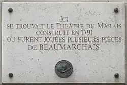 Den Bau eines zweiten Théâtre du Marais im Jahr 1791 in der rue de la Couture oder Culture Sainte-Catherine (heute rue de Sévigné) errichtete der Architekt Treprat für Courcelles, einen ehemaligen Schauspieler des Théâtre-Italien. Beaumarchais übernahm eine Teilfinanzierung, das Baumaterial stammte weitgehend aus der abgerissenen Bastille. Beaumarchais, der in der Nachbarschaft wohnte, ließ dort seine Werke aufführen. Der Saal wurde im Jahr 1807 auf Befehl Napoléons I. geschlossen (Napoleonisches Theaterdekret) und 1812 abgerissen. An seiner Stelle entstand ein öffentliches Badehaus.