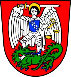 Blasonierung: „In Rot der auf einem widersehenden, blau bewehrten grünen Drachen stehende, golden nimbierte Erzengel Michael mit silberner Rüstung und silbernem Mantel; auf der Brust ein blaues Schildchen mit silbernem Schrägbalken, der mit drei blauen Ringen belegt ist; in der Rechten ein silbernes Schwert, in der Linken eine goldene Waage.“[13] |