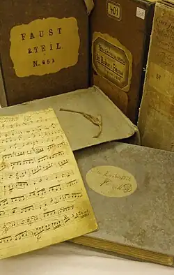 Seit 2002 wird der Bestand des Deutschen Nationaltheaters als Depositum im Hochschularchiv|Thüringischen Landesmusikarchiv Weimar unter bestmöglichen klimatischen und feuerschutztechnischen Bedingungen sachgerecht aufbewahrt. Darunter sind wertvolle Partituren, deren Geschichte oft am schlechten Erhaltungszustand ablesbar ist.[10] In vielen Fällen konnten diese mittlerweile dank privater Spender oder öffentlicher Unterstützungsgelder restauriert und gerettet werden. Es ist der seit dem späten 18. Jahrhundert gewachsene historische Notenfundus des Theaters in Vollständigkeit erhalten geblieben. Er überstand den Theaterbrand von 1825, die bewegten und oft verheerenden Zeiten der jüngeren deutschen Geschichte und steht heute, wissenschaftlich katalogisiert und erschlossen, den Forschern bei ihrer Suche nach noch unbekannten musikalischen Schätzen, nach wichtigen Zeugnissen der Praxis der Schauspielmusik bei Goethe, Schiller oder Shakespeare oder nach seltenen (Ur)-Aufführungsmaterialien mit autographen Eintragungen etwa von Franz Liszt oder Richard Strauss zur Verfügung.[11]