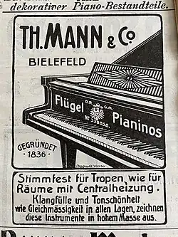 Mitte 1868 wurde der Neubau am Oberntorwall 29 in Bielefeld fertiggestellt und die Fabrik zog aus dem Gebäude Kreuzstrasse 565 aus. Gleichzeitig verlagerte Theophil Mann dorthin sein Ladengeschäft, das bis dato in der Obernstraße von Wilhelm Bertelsmann angemietet war.[37] Am 5. November registrierte Th. Mann unter seinem Namen und unter der Nummer 501 seine Firma im Firmenregister. Seiner Frau Sophie wurde Prokura erteilt.[38][39] Diese Prokura erlosch am 22. Februar 1894.[40] Zu diesem Zeitpunkt begann Th. Mann nachweislich damit, gebrauchte Instrumente zur Miete anzubieten.[41] In einer Anzeige im Bielefelder Wochenblatt vom 2. Mai 1874 wird die monatliche Miete für ein "gutes Pianino" mit 3 Thaler angegeben.[42]