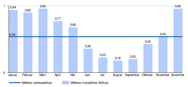 Der monatliche mittlere Abfluss (MQ) des Thalbaches in m³/s, gemessen an der hydrologischen Station Wittersdorf