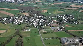 Luftaufnahme des Orts, in der unteren rechten Bildecke ein Teil des Steinbruchs.