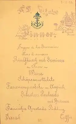 Für Oktober/November 1898 wurde sie vom Berliner Reisebüro Carl Stangen gechartert, um überwiegend deutsche Passagiere aus kirchlichen Kreisen[12] von Triest über Konstantinopel nach Jerusalem zu befördern, nachdem die zuvor im Rahmen der 185. Orientfahrt angebotenen Plätze auf der Bohemia[13] ausgebucht waren (siehe nebenstehende Abb. einer Speisekarte von der Fahrt und einer Postkarte an einen Fahrtteilnehmer). Diese Fahrt stand im Zusammenhang mit der Palästina-Reise des deutschen Kaisers Wilhelm II., die er zusammen mit dem teilnehmenden Hofstaat auf eigenen deutschen Schiffen (Hohenzollern, Herta und Hela) absolvierte, um am Reformationstag (31. Oktober) 1898 in Jerusalem die Erlöserkirche einzuweihen. Die Thalia-Billets kosteten in Abhängigkeit von der Lage der Kabinen zwischen 1.200 und 1.400 Mark.[14][15]