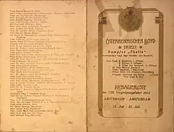 - ↑ Die auf der Liste ausgewiesenen Personen waren die letzten Teilnehmer an einer Vergnügungsfahrt des Schiffs. Ob die nächste Passagierliste für die ab 3. August 1914 geplante Reise, die sehr wahrscheinlich schon gedruckt war, noch zur Ausgabe gelangt war, ist nicht bekannt.
