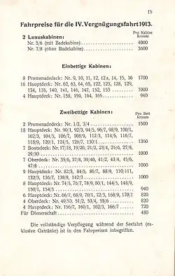 Bei Buchung der Luxuskabinen wurde ein etwas höheres Entgelt fällig. So kostete diese z. B. für eine Fahrt vom 11. April bis 12. Mai 1913 auf der Route „Triest-Marokko-Kanarische Inseln-Genua“ mit Bad 4.000 Kronen und ohne 3.600. Je nach Deck waren für Einbettkabinen 940 bis 1.700 Kronen und Zweibettkabinen 1.440 bis 3.000 Kronen – die Dienerschaft 480 Kronen (pro Bett) – zu entrichten, wobei die Kaufkraft einer Krone etwa 5 Euro entsprach.[22]