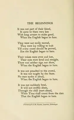 Die ersten vier Strophen haben vier Zeilen mit abwechselnden Reimen, während die fünfte (und letzte) Strophe fünf Zeilen enthält. Die letzte Zeile einer jeden Strophe endet mit "the English began to hate" (... die Engländer zu hassen begannen). Der Kontext ist das antideutsche Gefühl in Großbritannien während des Ersten Weltkriegs.[1][2] Kipling war dafür bekannt, dass er Deutsche nie in einem positiven Licht darstellte, und er war es, der das Wort "Hun" (Hunne) als Pejorativum für Deutsche berühmt machte.[3]