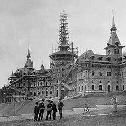 Der Basler Architekt Jacques Gros (1858–1922)[3][4] hatte einem bergseitig massiven Gebäude einen mit Turm und Dachreitern verzierten Holzblockbau vorgelagert. Pächter war Hürlimann selber. Waldhaus und Bergbahn rentierten so gut, dass sich die von Hürlimann gegründete Aktiengesellschaft entschloss, weiterzubauen.