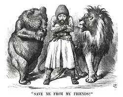 Die Angst der Briten, vor einem Angriff des Russischen Kaiserreichs auf Britisch-Indien, ließ sie deren Aufmerksamkeit auf andere Gebiete lenken. Die Krim erwies sich als solches, da durch den Krimkrieg alle Aufmerksamkeit nun bei der Halbinsel lag, jedoch war der Krieg auch ein Versuch den russischen Gegner zu „verstümmeln“ und die Gebiete wieder dem Osmanischen Reich wiederzugeben.[10] Nach der Niederlage des Kaiserreiches musste auch die Schwarzmeerküste entmilitarisiert werden, was dann zur nächsten Aufmerksamkeit führte, da man von russischer Seite aus, diese schnell wieder bewaffnen wollte. Dies gelang dann auch im Winter 1870 und da das Militär reformiert wurde, war die Gefahr noch größer für einen Überfall auf Britisch-Indien. Durch den Dreikaiserbund gab es eine Annäherung Russlands zum Deutschen Reich und Österreich-Ungarn. Dies erhöhte die Wahrscheinlichkeit für einen Angriff auf Indien, da Deutschland neutral sein würde und der Zar sich nun stärker auf den Nahen und Mittleren Osten konzentrieren konnte.[11] Nach dem Auslaufen des Dreikaiserbundes und dem Rückversicherungsvertrag wandte sich Großbritannien Frankreich zu und gründete, trotz Spannungen (siehe: Faschoda-Krise), die Entente cordiale 1904. Später wurde das Russische Kaiserreich auch aufgenommen (Triple Entente 1907). Dies erfolgte auch, um die Kriegsgefahr in Indien zu verringern. Das Deutsche Kaiserreich fühlte sich dadurch bedroht und rüstete noch stärker auf, was die Aufmerksamkeit des russischen Militärs auf Europa richtete.[12]