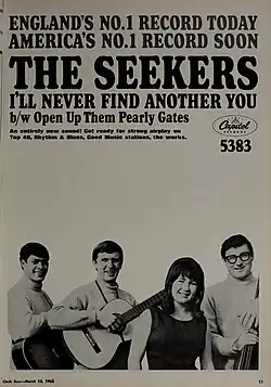 Sie nannten sich The Seekers und waren bald so populär, dass sie ihre Berufe aufgaben und hauptberufliche Musiker wurden. Ende 1964 gingen sie nach England, traten bereits drei Wochen nach Eintreffen in diversen TV-Shows auf und hatten Anfang 1965 ihren ersten Nummer-eins-Hit und Millionenseller[2] mit I'll Never Find Another You, einem Lied, das Tom Springfield, der Bruder von Dusty Springfield, geschrieben hatte. Er war auch in der Folgezeit für die meisten Songs der Band verantwortlich.