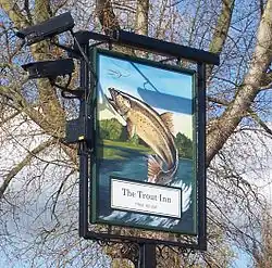 Das The Trout Inn ist ein Grade II geschütztes Baudenkmal, das im Wesentlichen auf das 17. Jahrhundert zurückgeht. Einige Änderungen und Ergänzungen stammen aus dem 18. Jahrhundert.[1] Eine hölzerne Fußgängerbrücke am Pub ist ebenfalls ein Grade II geschütztes Bauwerk.[2]
