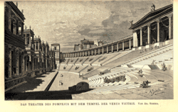 Der erste feste Bühnenbau ist das theatrum lapideum, das Pompeius 55 v. Chr. auf dem Marsfeld in Rom errichten ließ[7]. Dieses nach ihm benannte Pompeiustheater war Teil eines großen Komplexes in Tibernähe, in dem sich auch ein Heiligtum der Göttin Venus befand. Der Zuschauerraum (cavea, ‚(Aus-)Höhlung‘) bestand aus halbkreisförmig angelegten ansteigenden Sitzreihen mit mehreren Zugängen (vomitoria, Singular vomitorium, von vomere, ‚ausspeien‘, weil es von der Bühne gesehen aussieht, als ob die vomitoria die Zuschauermengen ausspien). Durch Korridore (praecinctiones) und durch Treppen konnte man sich zu den einzelnen Sitzplätzen bewegen. Die einzelnen Zuschauerblöcke (cunei, Singular cuneus, ‚Keil‘) waren durch Korridore voneinander getrennt. Am oberen Abschluss des Zuschauerraumes befand sich sehr häufig eine überdachte Galerie, bzw. ein Säulengang (porticus). Bei sehr heißem Wetter konnte man zusätzlich auch ein Sonnensegel (velarium) über den Sitzreihen, mit Verankerungen an der Außenwand in der Höhe der Galerie, befestigen.