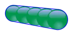 Das Volumen der konvexen Hülle einer Wurstpackung aus Kugeln mit dem Radius lässt sich aus elementaren geometrischen Körpern berechnen. Die Hülle besteht in der Mitte aus einem Zylinder der Höhe und an den beiden Enden aus je einer Halbkugel mit dem Radius . Das Volumen der konvexen Hülle berechnet sich deshalb nach der folgenden Formel.