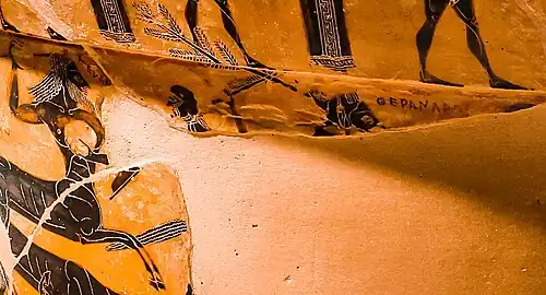 Der Name Therandros, auf der Vase in griechischen Majuskeln als ΘΕΡΑΝΛΡΟΣ, THERANLROS, zu erkennen (siehe Bild), ist wohl als ΘΕΡΑΝΔΡΟΣ, THERANDROS, zu lesen. In Minuskeln ergäbe sich dann ein θέρανδρος, Thérandros, lateinisch und deutsch mit abweichender Betonung Therándros oder Therándrus, da die vorletzte Silbe durch die drei Konsonanten ndr lang ist. Diskutiert werden auch andere Varianten: Θήρανδρος, Thḗrandros, Θέρρανδρος, Thérrandros, Θέρσανδρος, Thérsandros.[1]