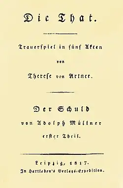 - Die That. Trauerspiel in fünf Akten. Der Schuld von Adolph Müllner erster Theil. Pesth 1817. (Digitalisat)